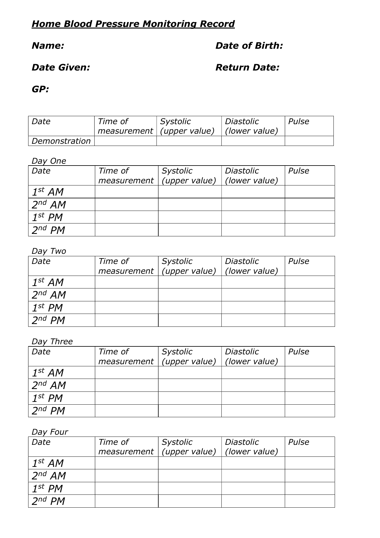 Home Blood Pressure Monitoring Record Name Date Of Birth Date