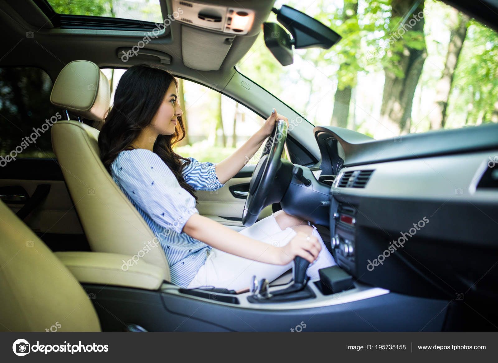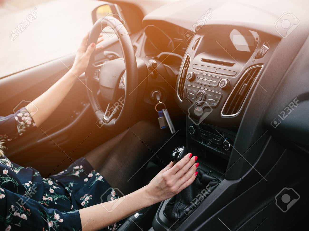 Young Woman Changing Gears In Car Driving A Car Stock Photo